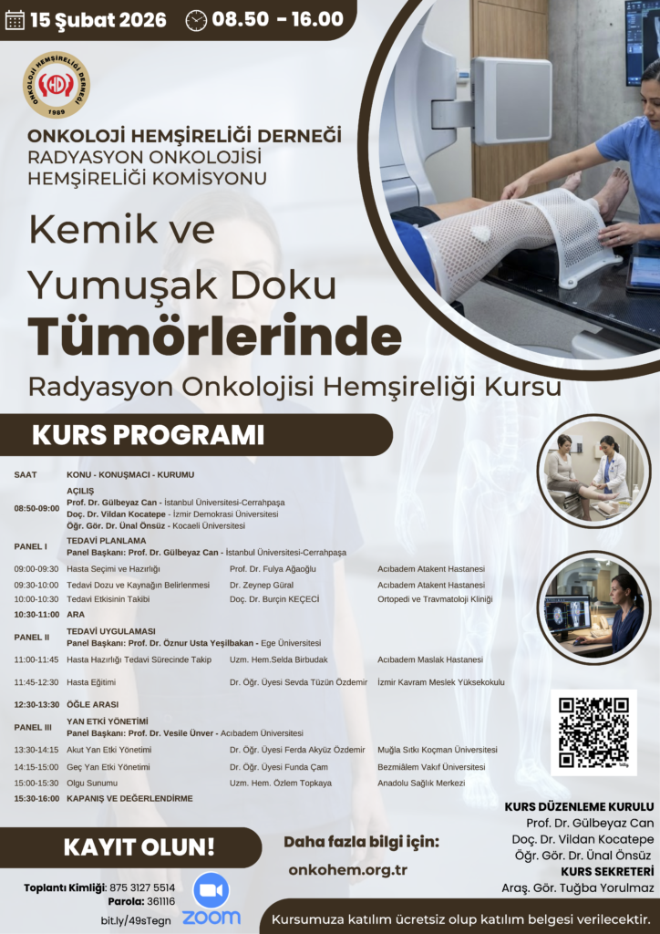 Arşiv, Kurslar, Radyasyon Onkolojisi Hemşireliği Komisyonu, Toplantılar Kemik ve Yumuşak Doku Tümörlerinde Radyasyon Onkolojisi Hemşireliği Kursu 3 hafta önce / FacebookXRedditPinterestEmailGoogle+LinkedInWhatsAppStumbleUponvKontakte 15.02.2026 @ 08:50-16:00 Toplantıya katılmak için