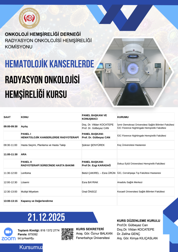 Arşiv, Radyasyon Onkolojisi Hemşireliği Komisyonu Hematolojik Kanserlerde Radyasyon Onkolojisi Hemşireliği Kursu 2 ay önce / FacebookXRedditPinterestEmailGoogle+LinkedInWhatsAppStumbleUponvKontakte 21.12.2025 @ 09:00-13:15 Zoom ID: 816 1372 2774 Parola: 875092 Katılmak için